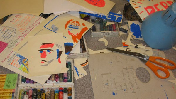 Des objets,des objets ;des objets sur les tables. Des tables,des tables,des tables et puis des pinceaux,de la peinture,de la (…)