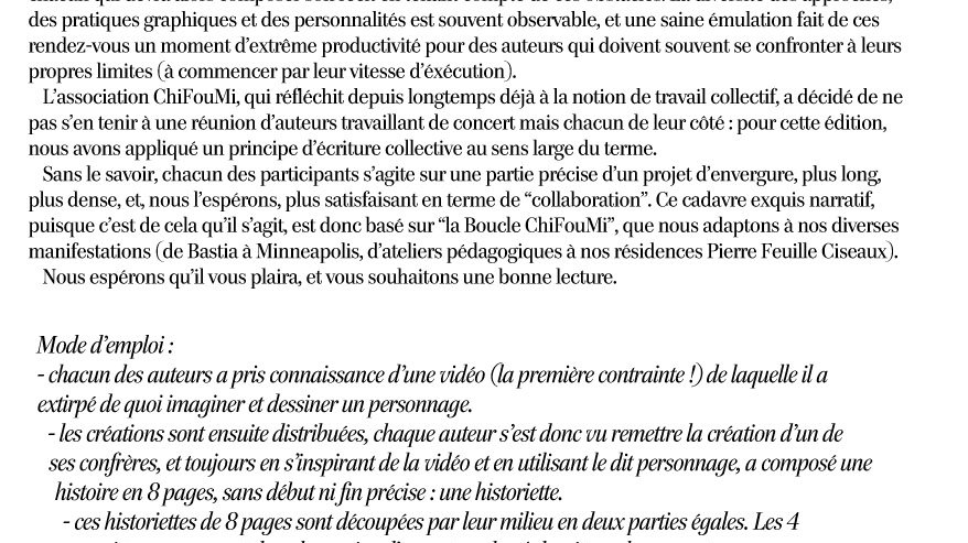 Les résultats des 24 heures de la bande dessinée proposées par l’association ChiFouMi les 7 et 8 novembre 2015 à la Saline royale d’Arc et Senans : un gigantesque cadavre exquis narratif signé de 16 auteurs pour un total de 320 pages, dont voici l’une des parties.