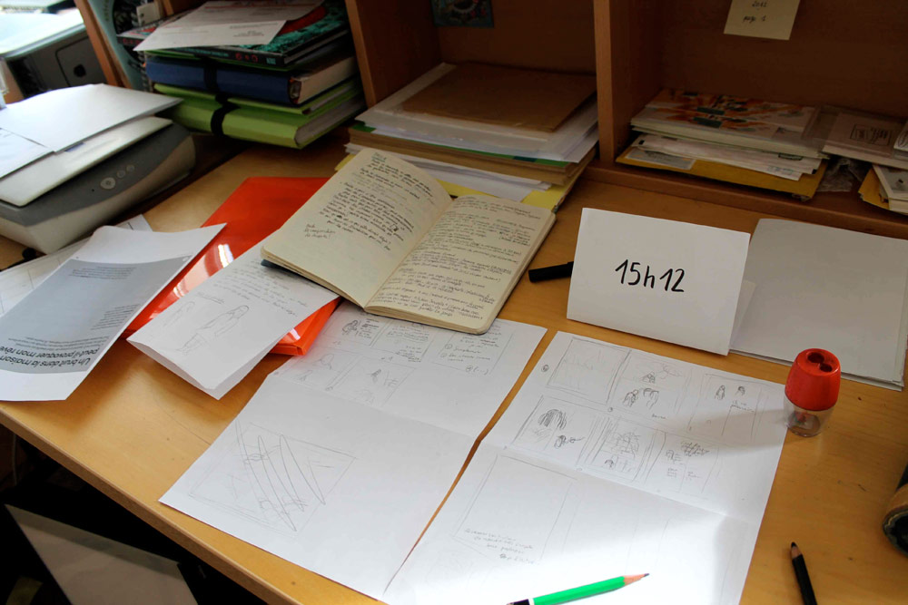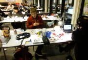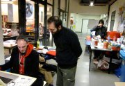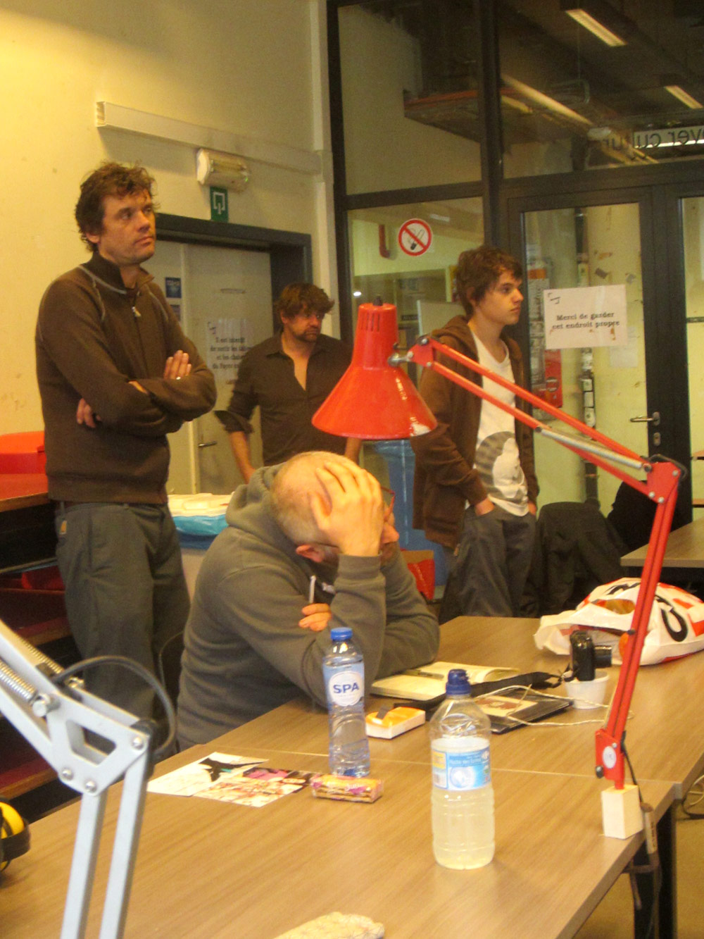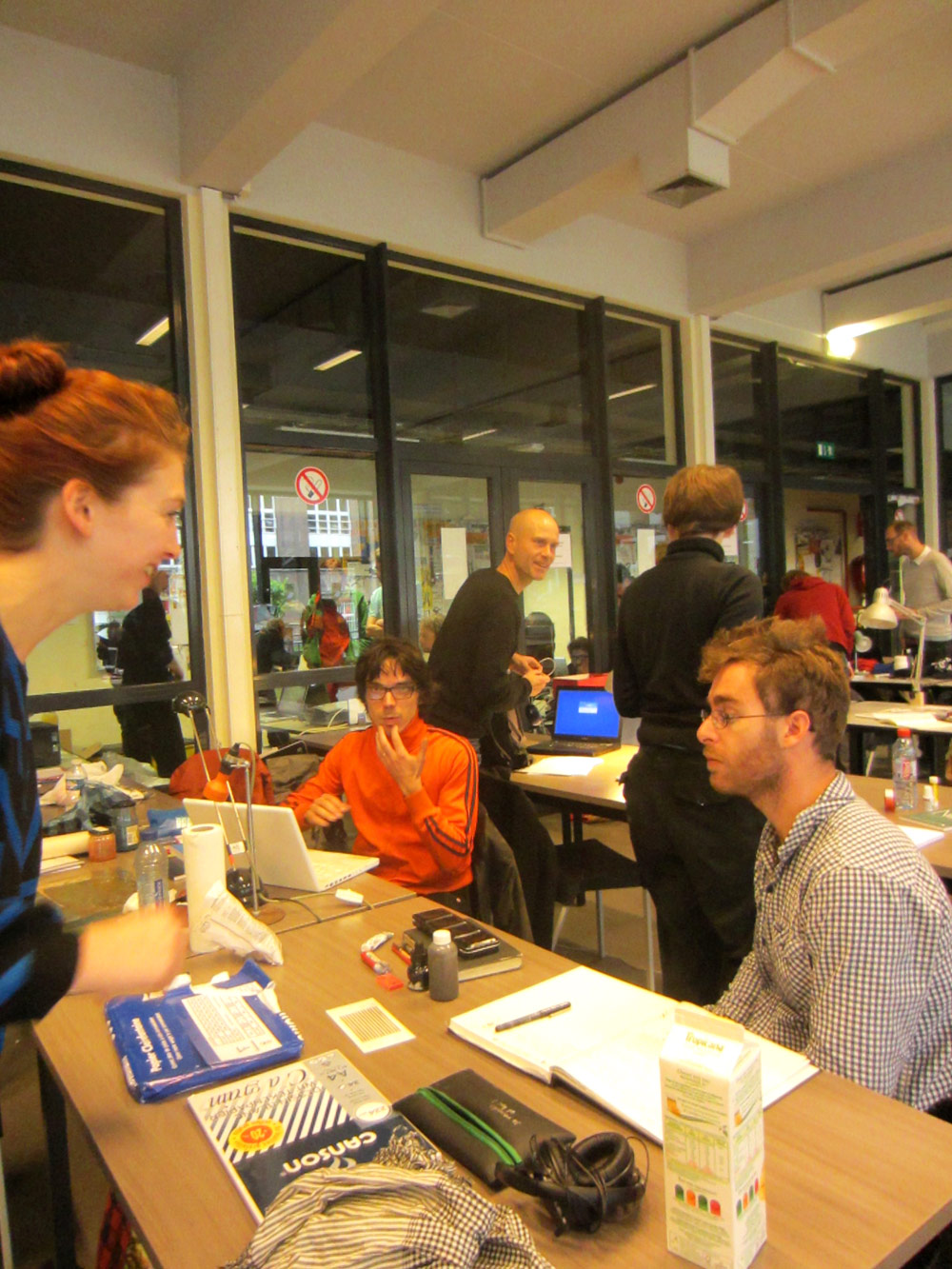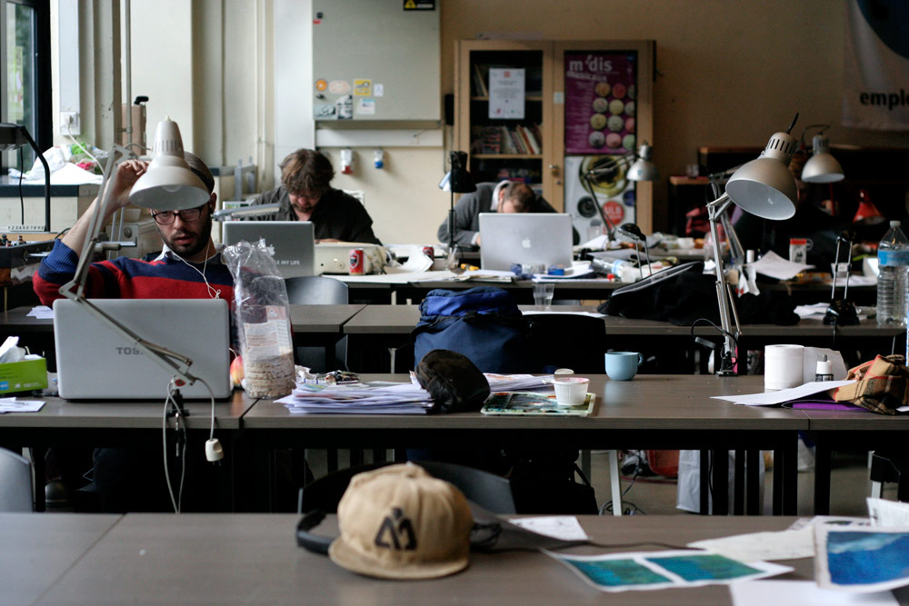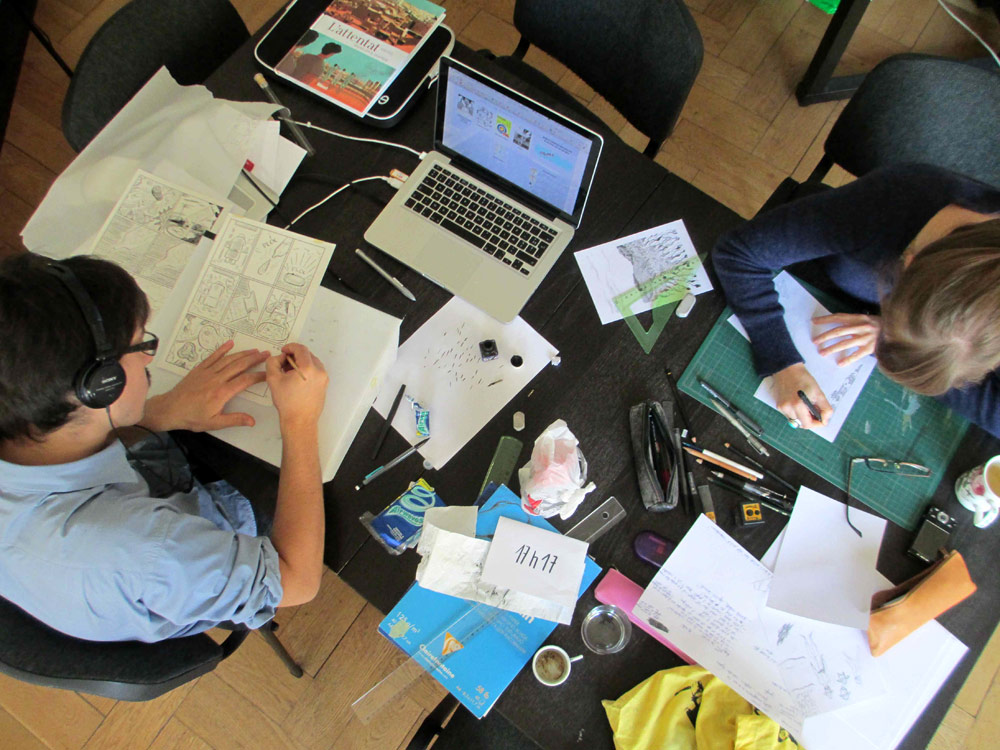 Excepté les personnes qui travaillent derrière un écran, on a des amoncellements de planches, recherches, notes, voire quelques cookies, et les outils en vrac.