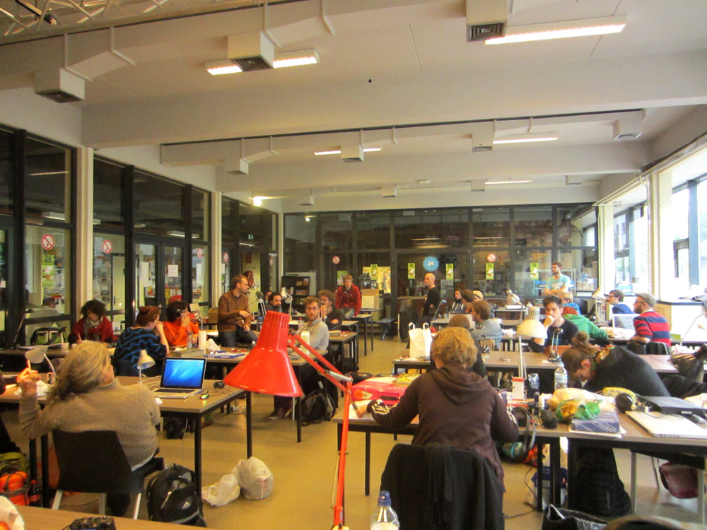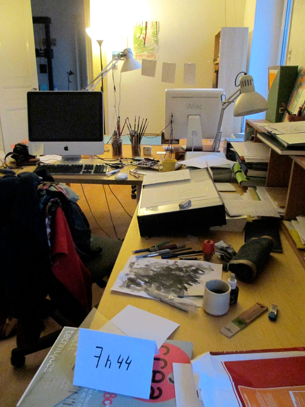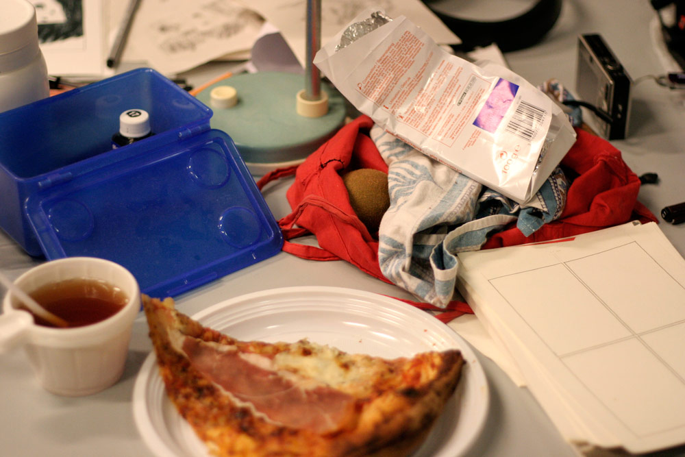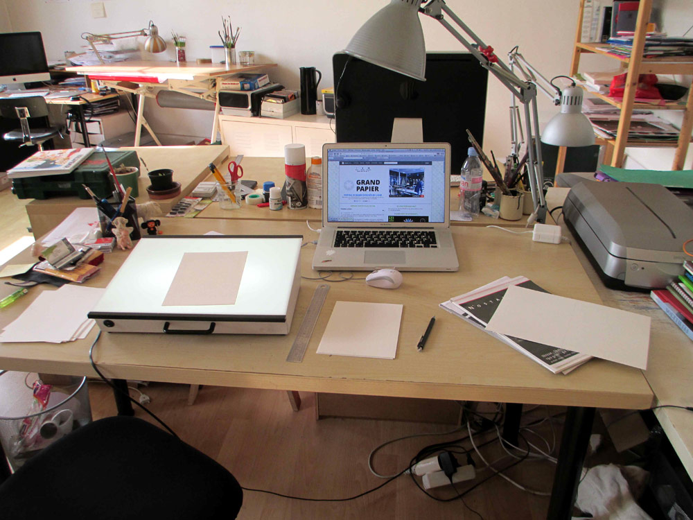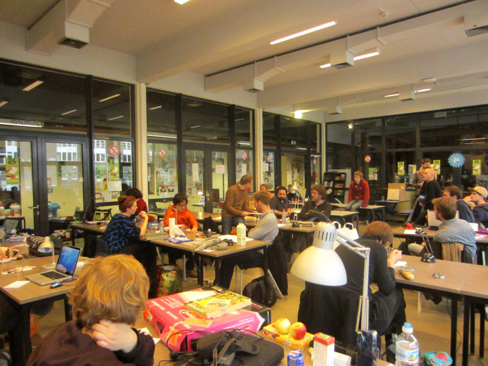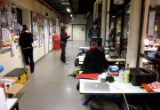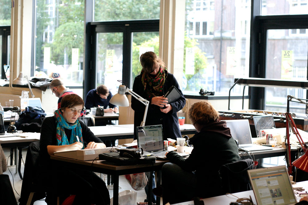 Excepté les personnes qui travaillent derrière un écran, on a des amoncellements de planches, recherches, notes, voire quelques cookies, et les outils en vrac.