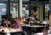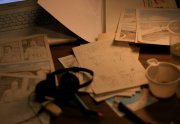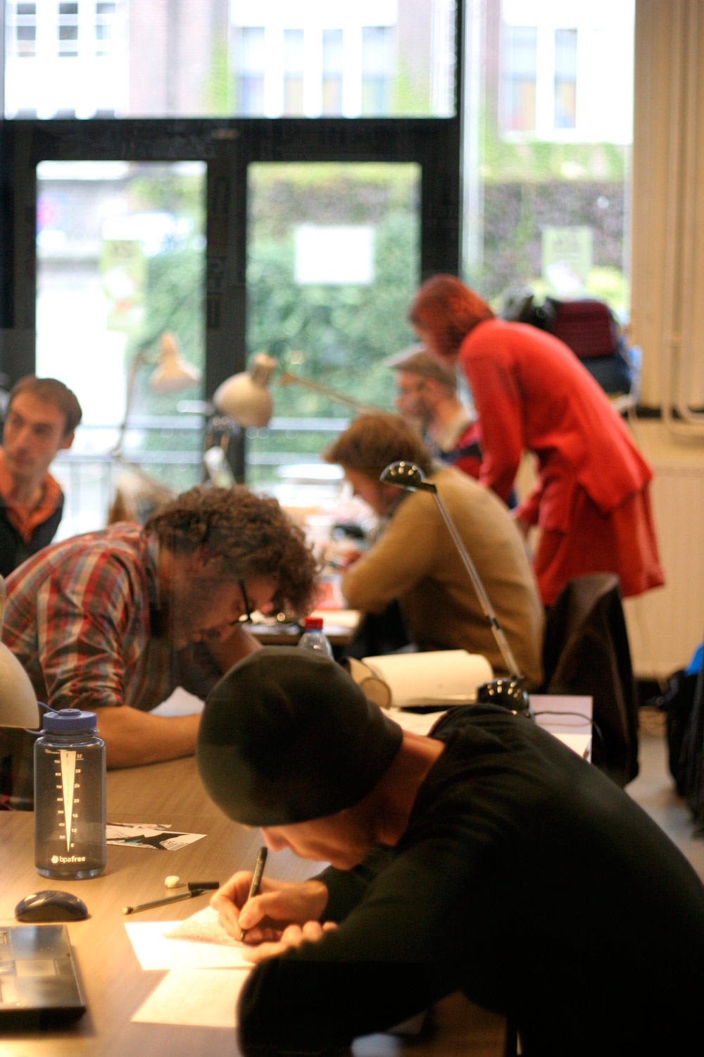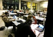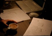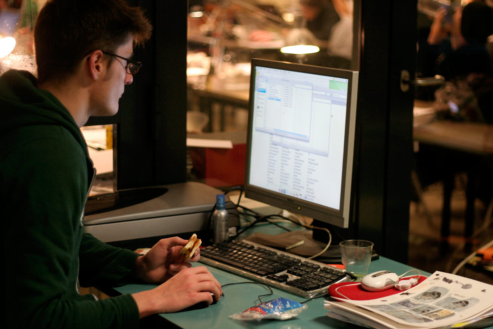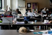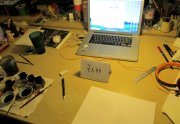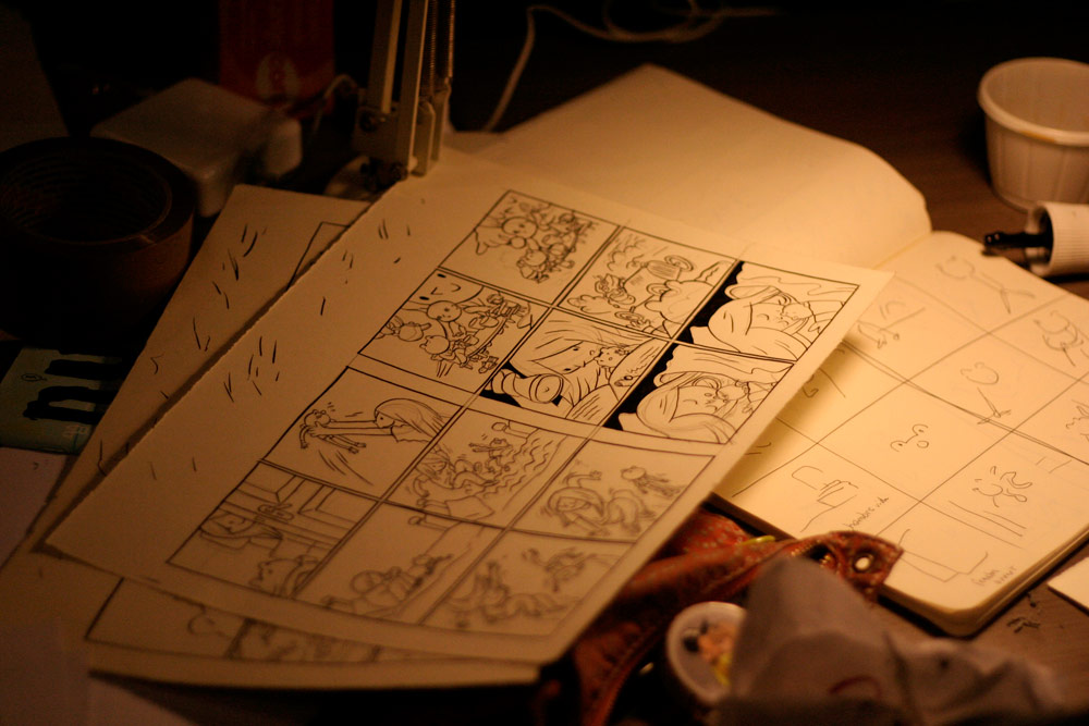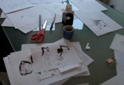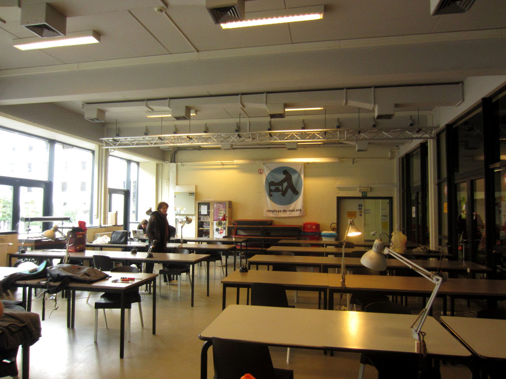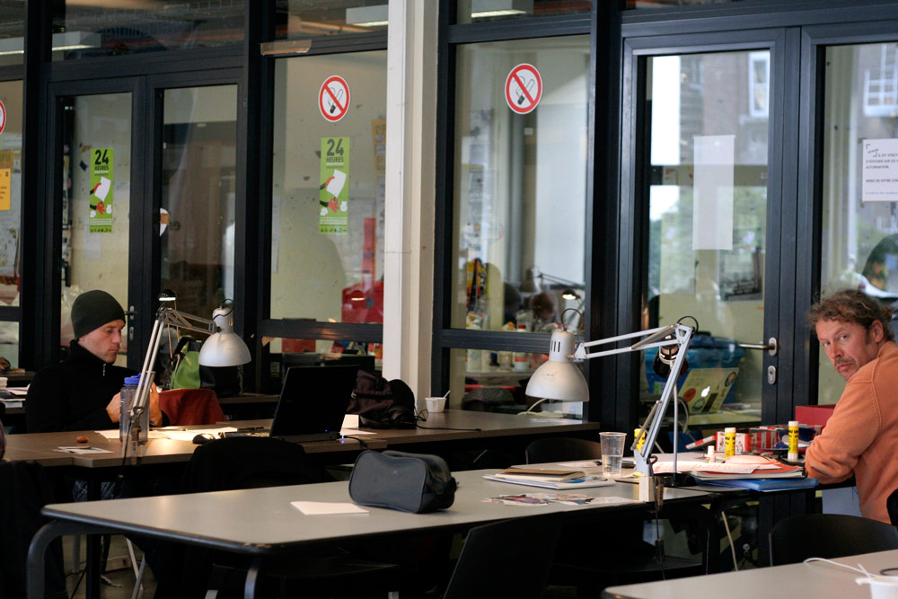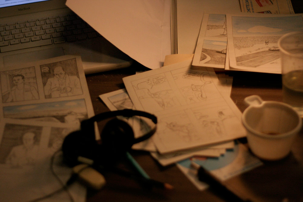 Excepté les personnes qui travaillent derrière un écran, on a des amoncellements de planches, recherches, notes, voire quelques cookies, et les outils en vrac.