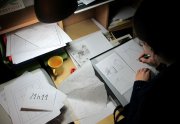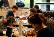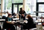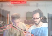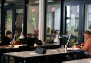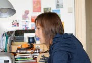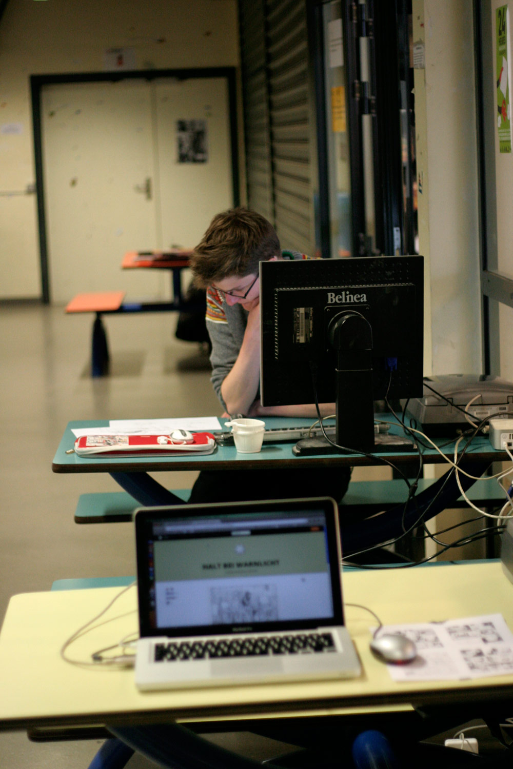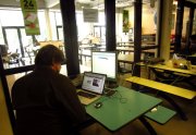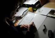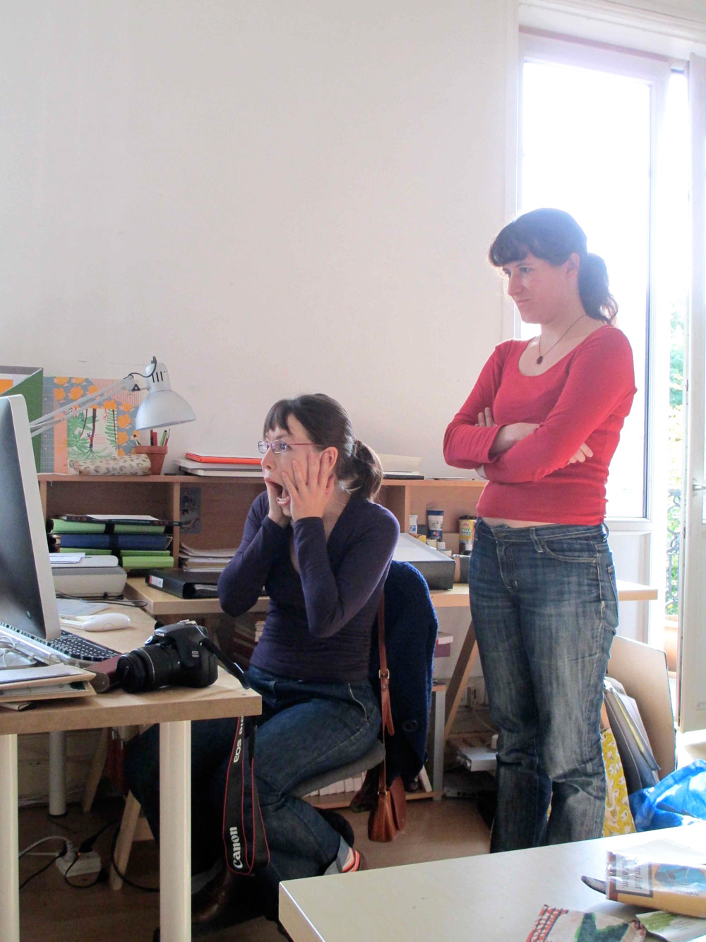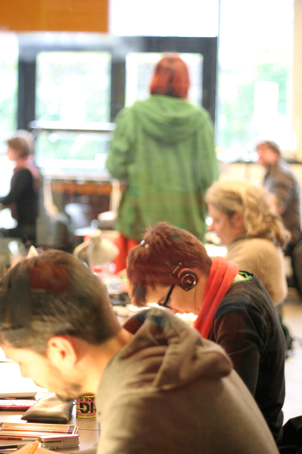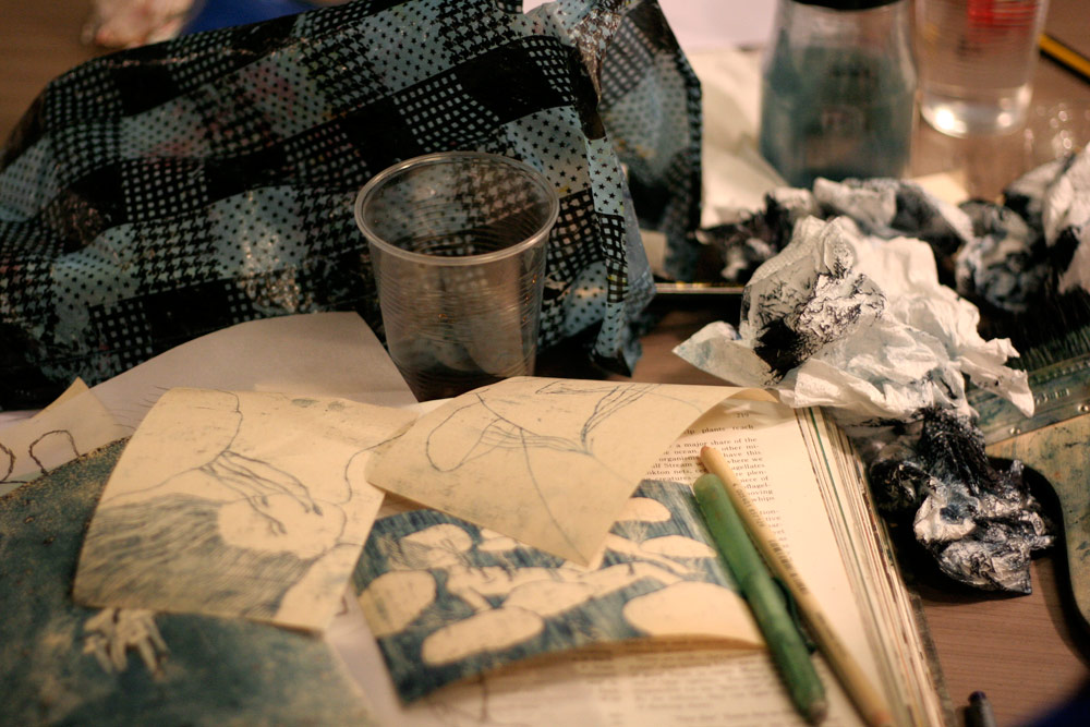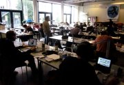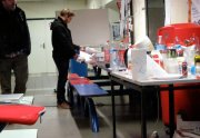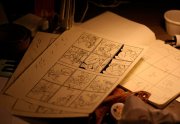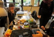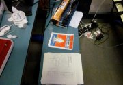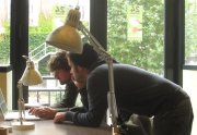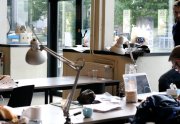 Excepté les personnes qui travaillent derrière un écran, on a des amoncellements de planches, recherches, notes, voire quelques cookies, et les outils en vrac.