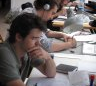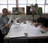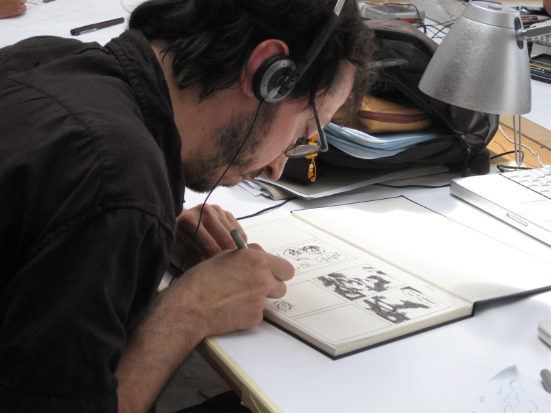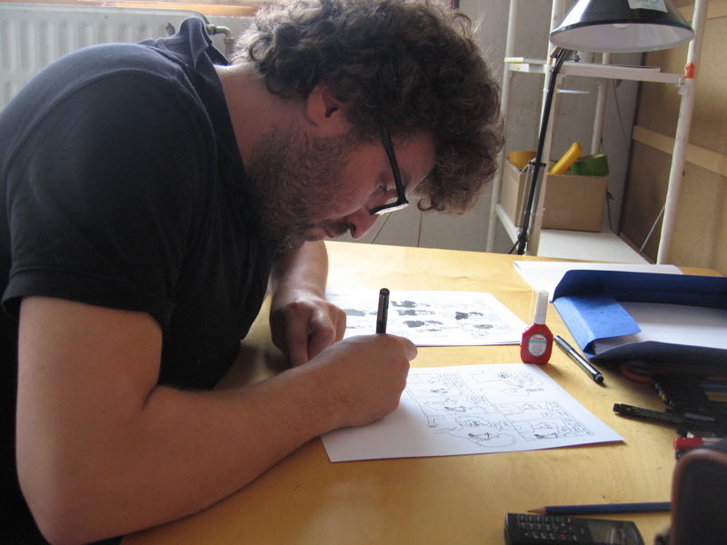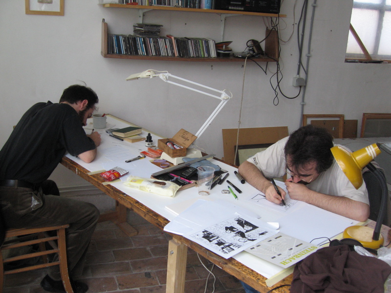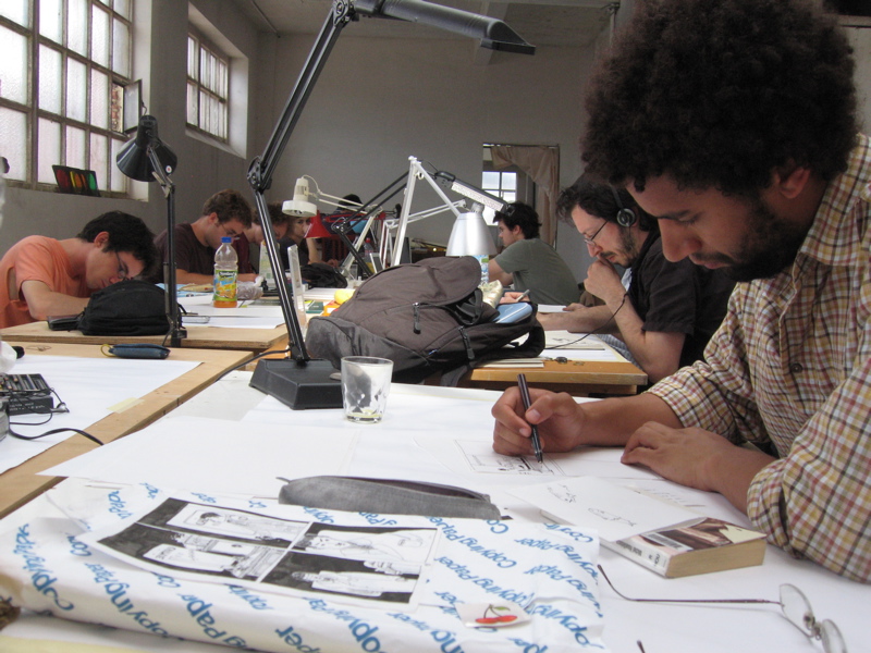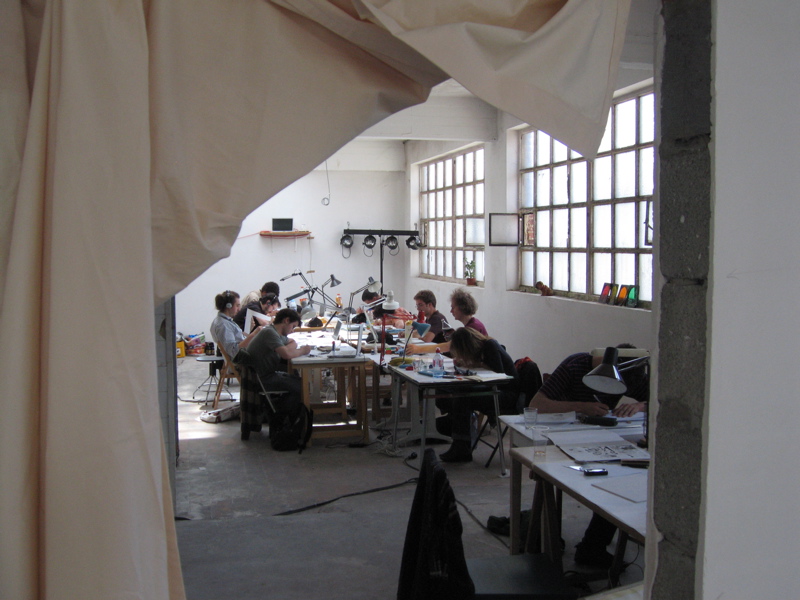 Albert Splouf tente de réanimer son GSM après avoir dessiné un superbe plan des lieux. Laurent Dandoy répond au sien (de GSM) : « Je suis occupé là ! » puis quitte sa table pour dessiner dans le canapé. David Libens a déjà fait six planches. Joanna Lorho cherche l’inspiration à la fenêtre. Max dessine des skateurs. Louis Vanardois découpe, découpe. Olive Booger écrit des lignes et des lignes. Alex de Moté philosophe et google des Goldarak : « Je connais pas le générique par cœur », s’excuse-t-il. Les klaxons d’un mariage brise le silence terrible de l’atelier, mais on continue à chuchoter, à murmurer.