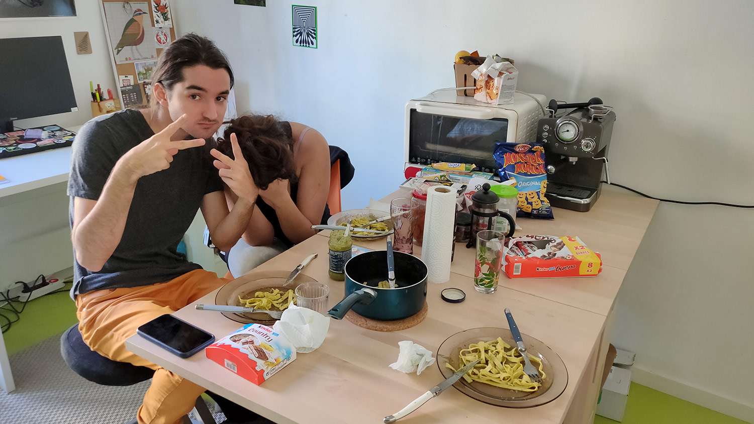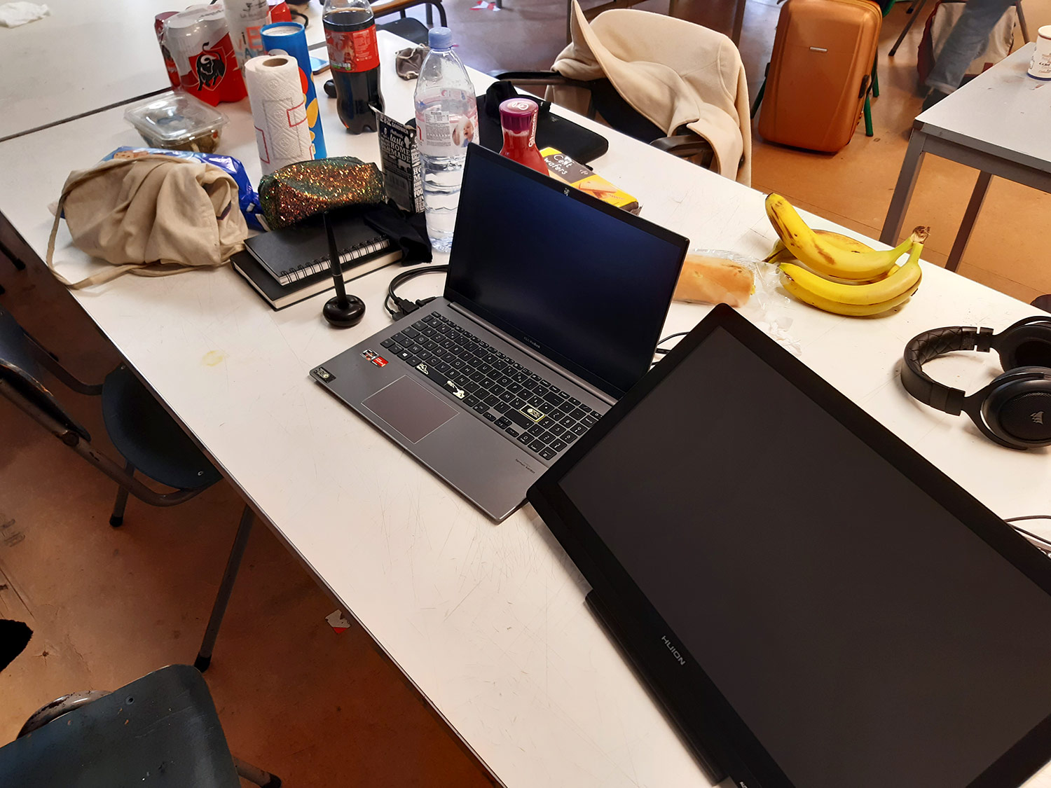 De quoi manger avant de démarrer et des bureaux qui se mettent en état de marche, voilà quelques photos avant le départ !